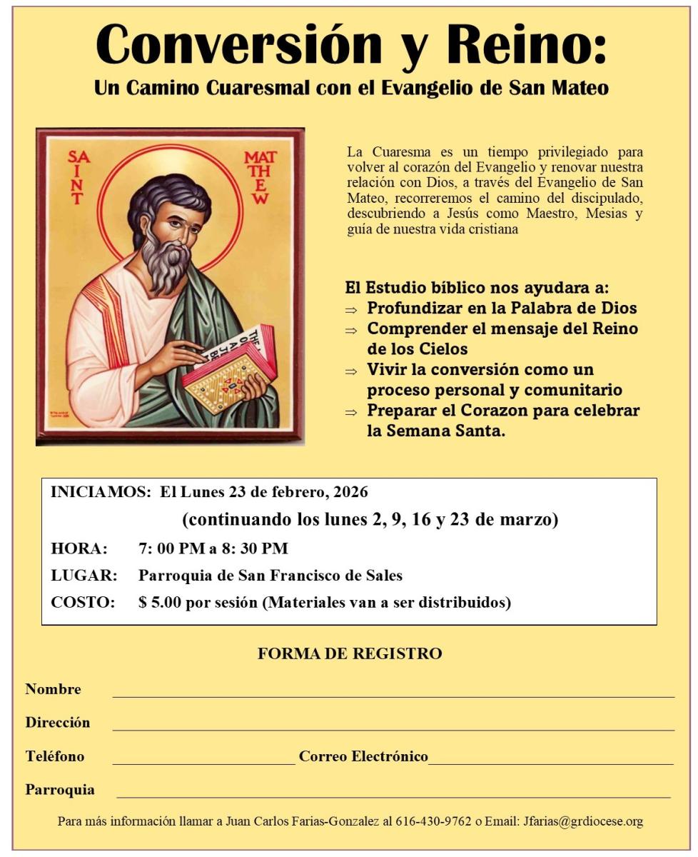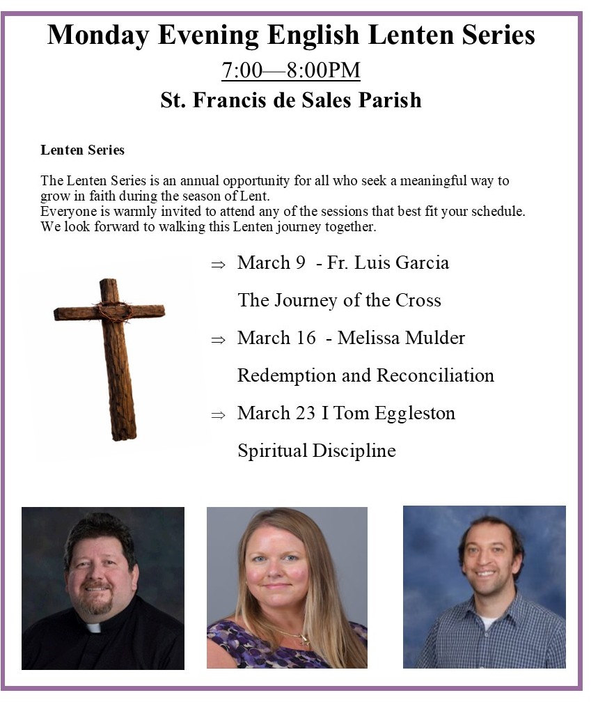 The Lenten Series is designed to help you to learn and grow in your faith during the Lenten season. Please join us for prayer, reflection, and spiritual growth. La Serie de Cuaresma está diseñada para ayudarle a aprender y crecer en su fe durante la temporada de Cuaresma. Únase a nosotros para la oración, la reflexión y el crecimiento espiritual.